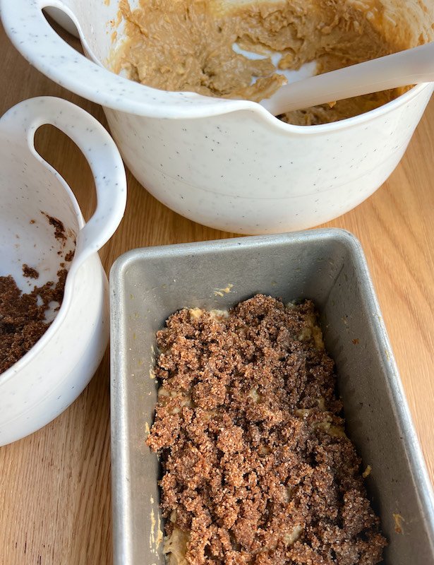 - pour half of the batter in a greased bread loaf pan and then add the crunch mix on top of the batter. then, pour the remaining batter on top and repeat with the crunch mixture.