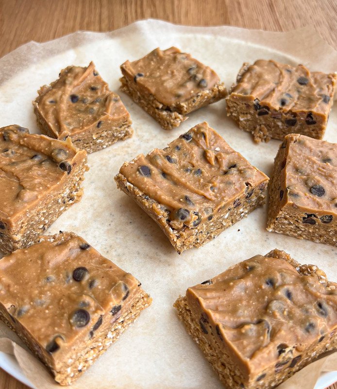 - enjoy your chewy chocolate chip cookie dough oat squares!