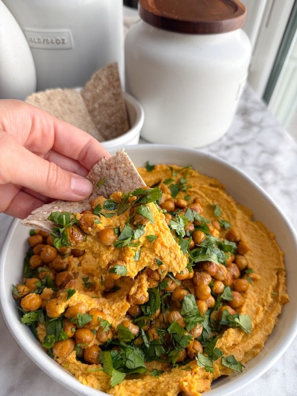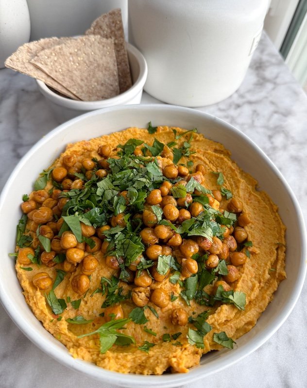 creamy roasted carrot hummus with garlic and tahini (easy + healthy)