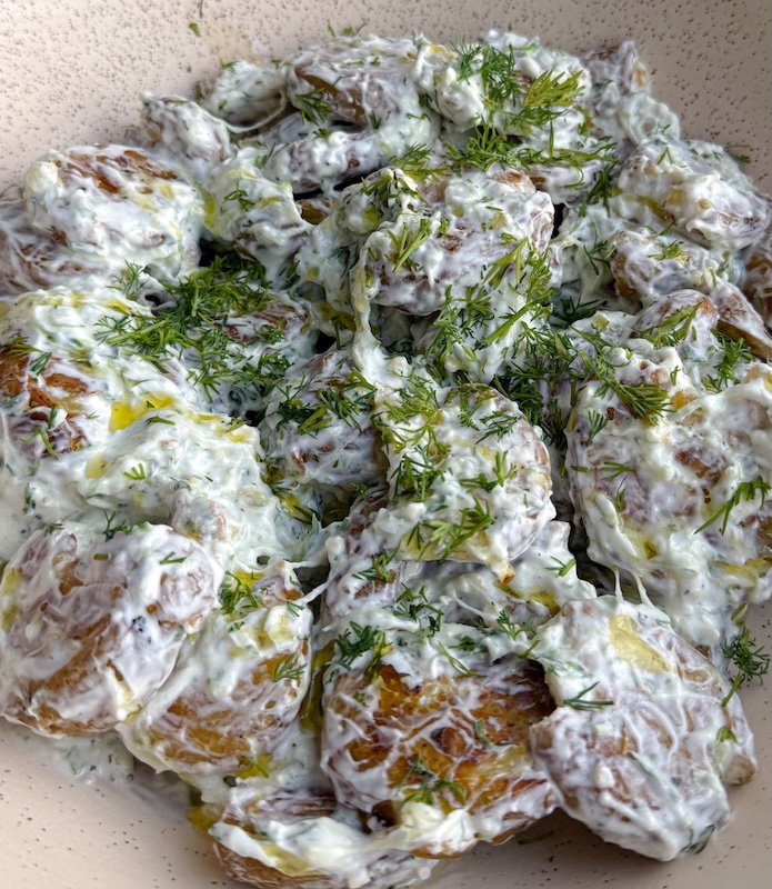 - let the potatoes cool slightly, then gently fold them into the tzatziki