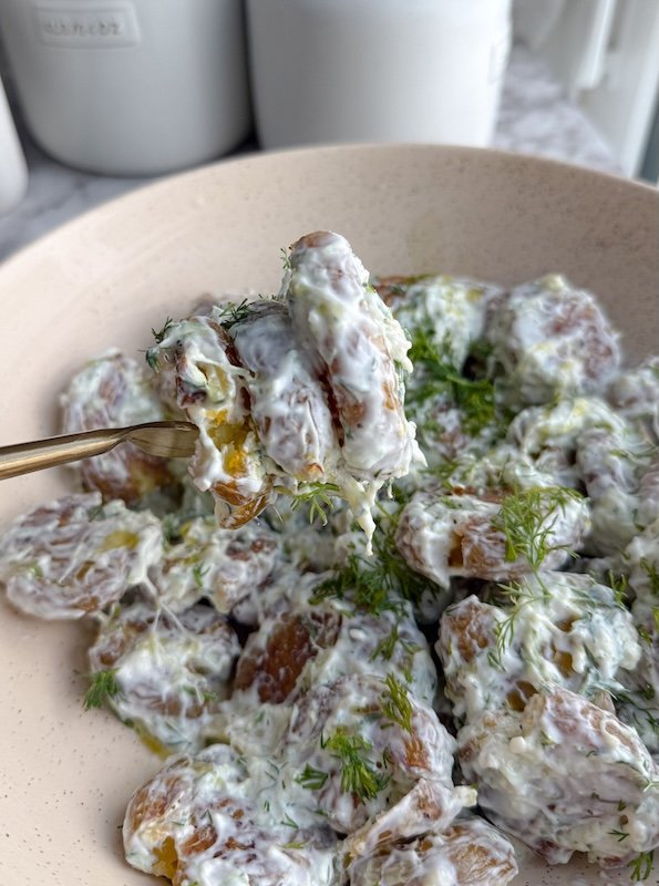 the textures, the herbs, the yogurt — they all stay true to traditional tzatziki, but the potatoes make it heartier, a little rustic, and honestly, just really fun to eat.