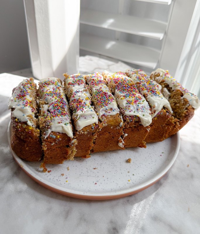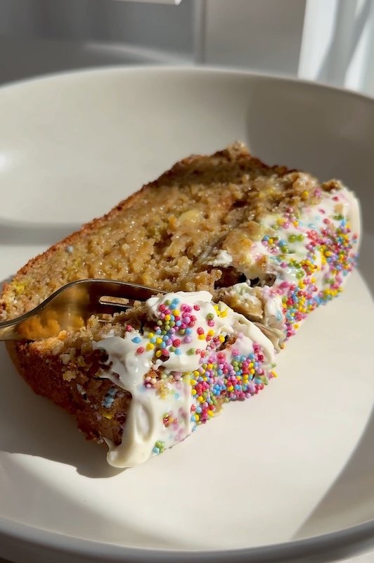 think banana bread meets birthday cake but in an everyday, snack-able way.