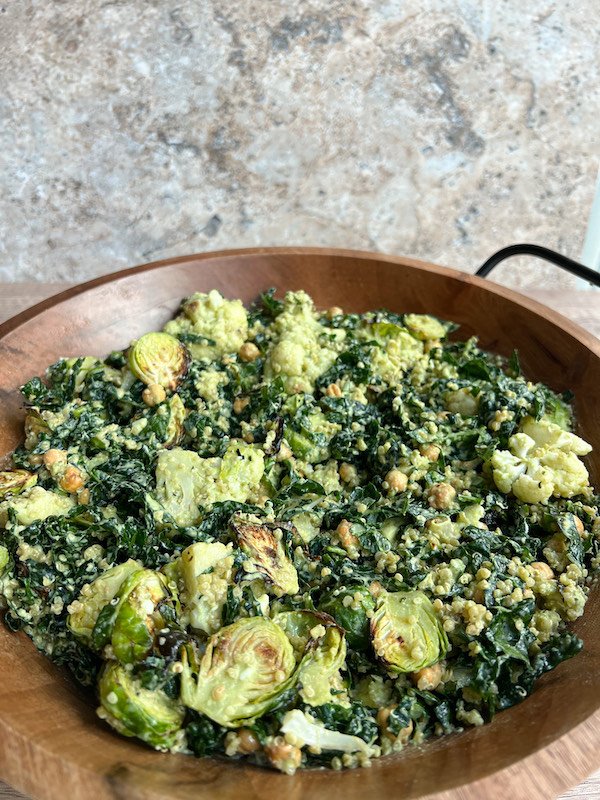 the roasted brussels sprouts and cauliflower florets bring a caramelized crunch, complemented by the nutty richness of hemp hearts.