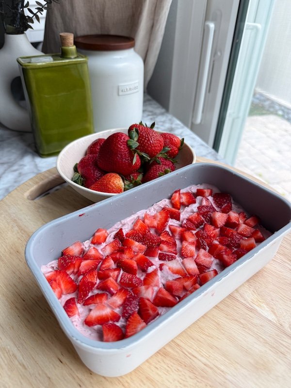 • when soft and scoopable, transfer to a loaf pan or container, top with fresh chopped strawberries, and freeze for another hour.