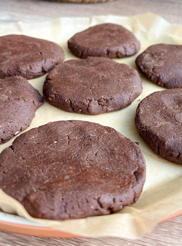 - line a baking sheet with parchment paper. using your hands, form the dough into cookie shapes and place them onto the prepared baking sheet. place in the freezer for 1 hr.