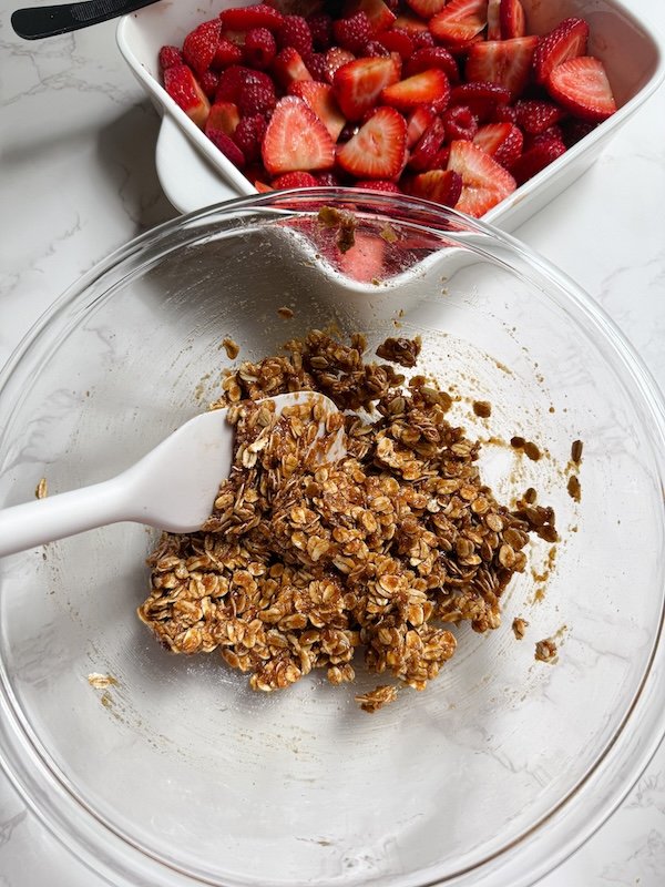 - in a medium bowl, mix the chopped strawberries, raspberries, 1/8 cup coconut sugar, and 1 tsp cinnamon. stir until evenly coated and pour into the prepared baking dish.