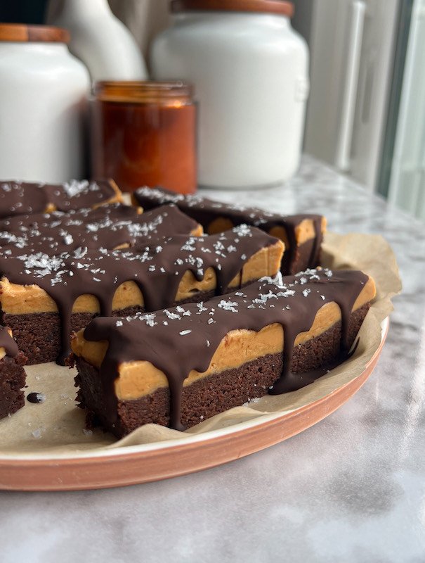 - make the peanut butter layer – in a bowl, mix peanut butter, lakanto powdered sugar, vanilla extract, and a pinch of salt until smooth. spread evenly over the brownie base. return to the freezer for at least 45 minutes.