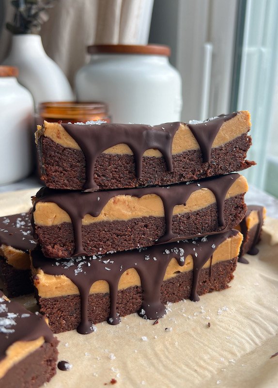 - make the peanut butter layer – in a bowl, mix peanut butter, lakanto powdered sugar, vanilla extract, and a pinch of salt until smooth. spread evenly over the brownie base. return to the freezer for at least 45 minutes. then, cut into 8 large bars.
