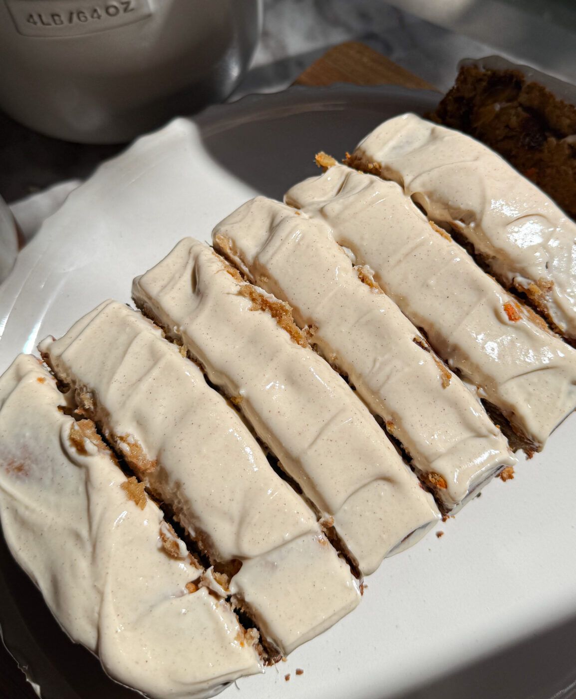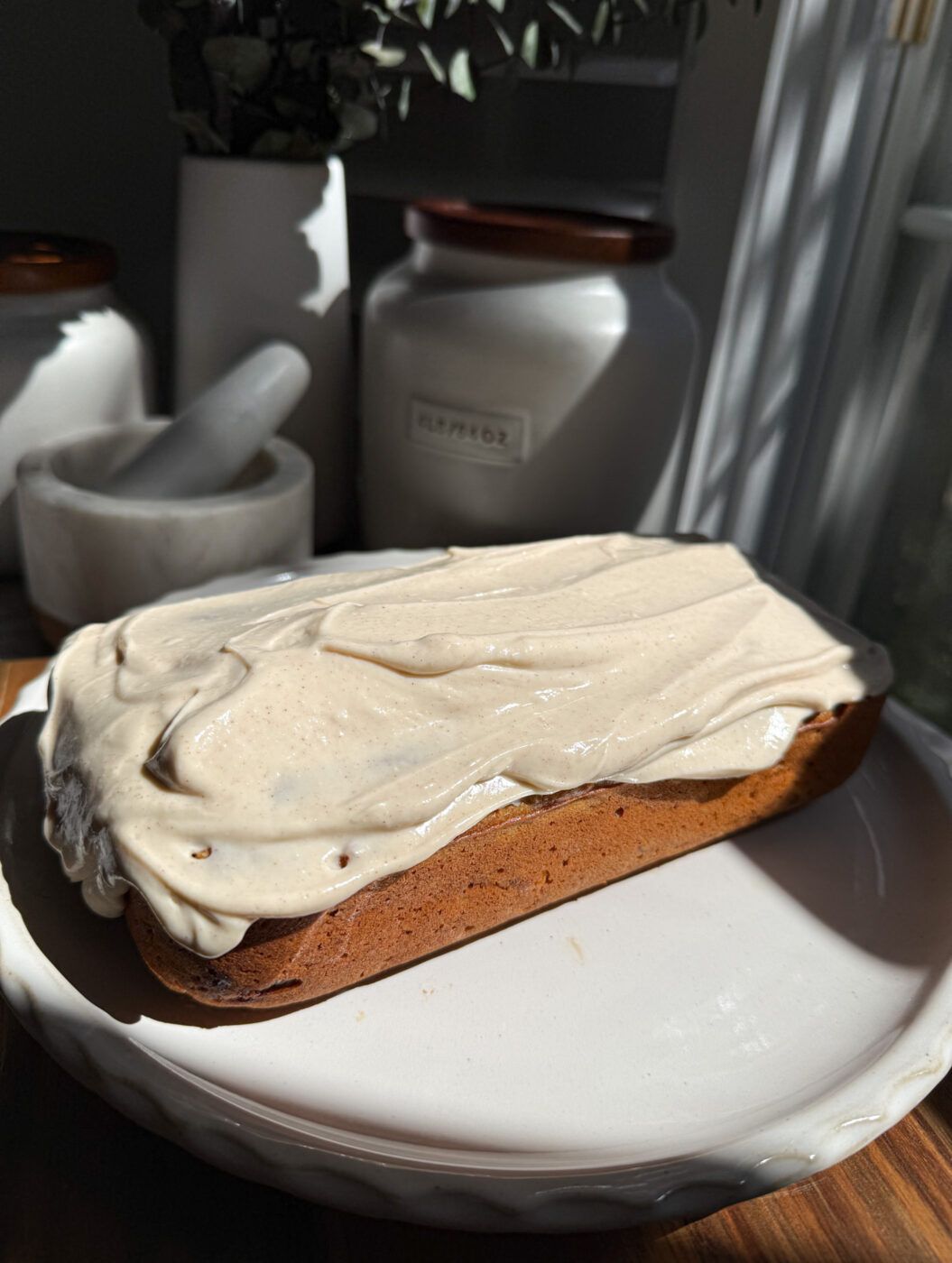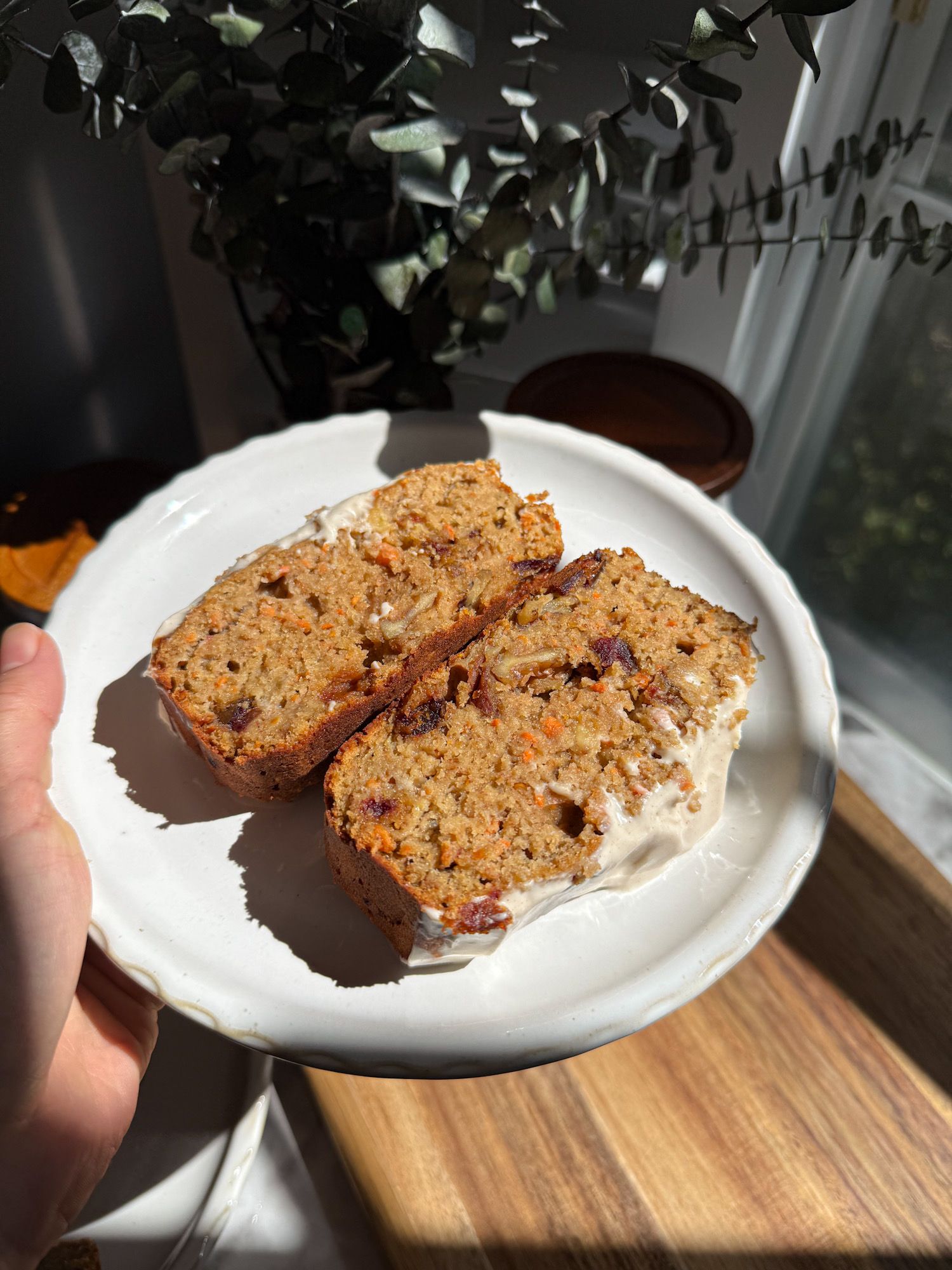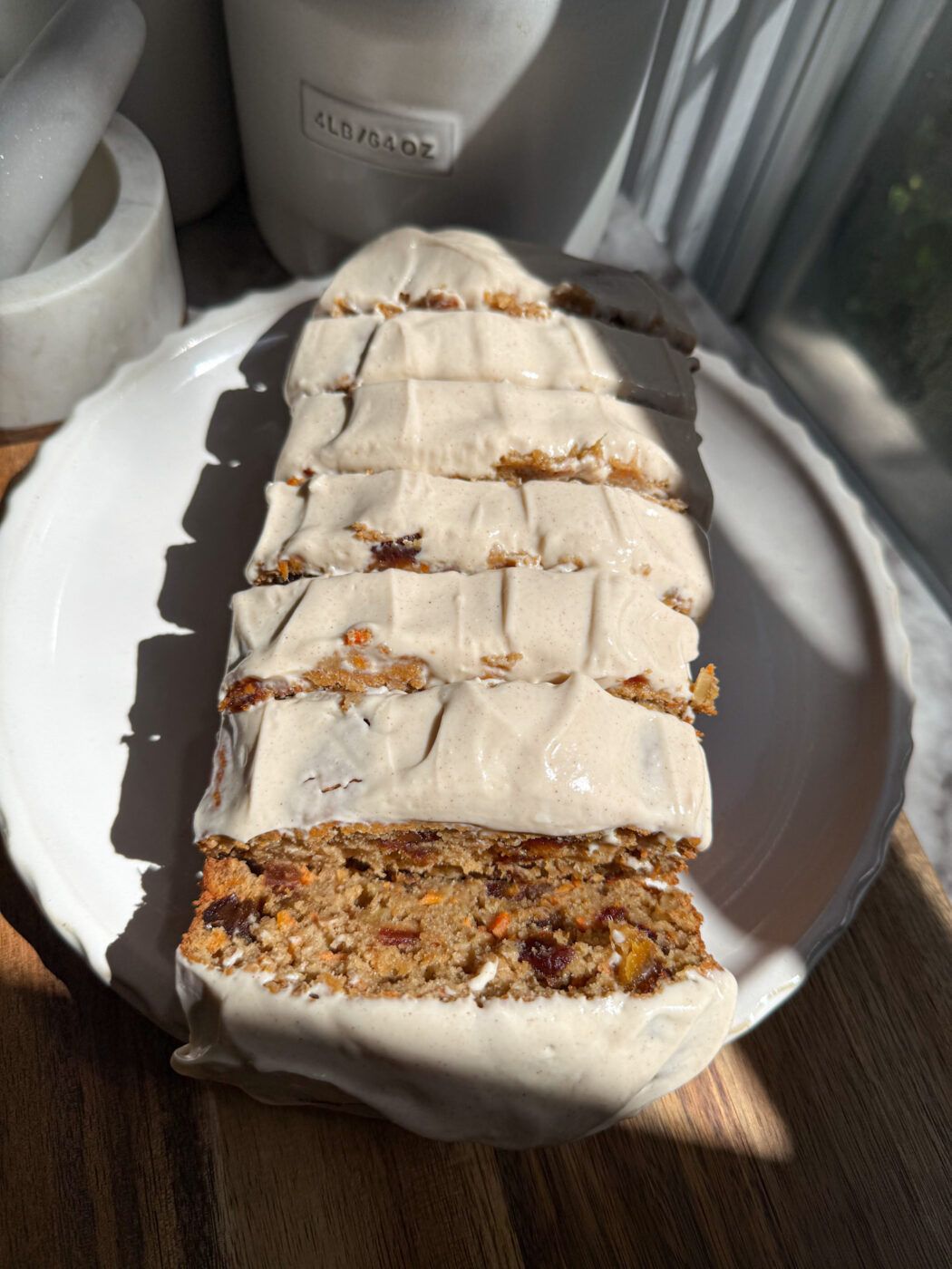chopped dates melt into the crumb for natural sweetness, walnuts add texture, and shredded carrots bring that classic carrot cake feel. it’s finished with a lightly sweet maple cinnamon cream cheese frosting that ties everything together without overpowering the bread.