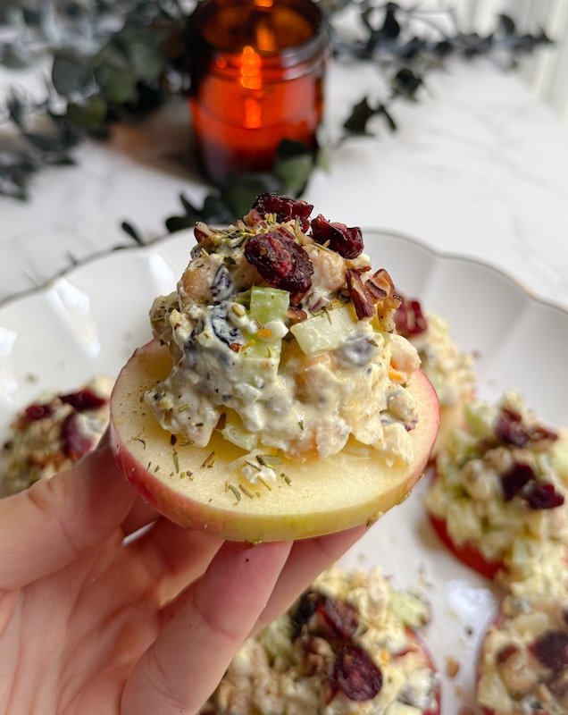crisp, juicy apples pair perfectly with a creamy chickpea salad that’s loaded with cozy curry spice, a hint of sweetness from dried cranberries, and the buttery richness of toasted pecans.