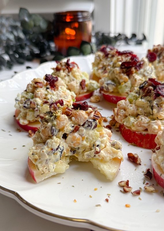 if you’re looking for the easiest, crunchiest, most flavor-packed holiday appetizer or midday snack, these curried chickpea salad apple bites check every box.