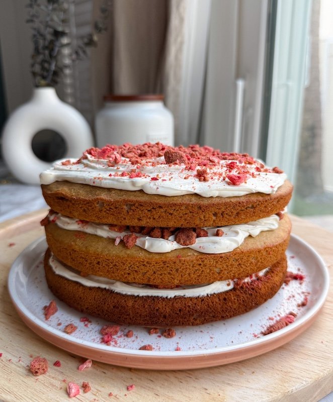 the idea here is to recreate that same layered flavor and texture: soft vanilla and strawberry cake, creamy frosting, and a sweet crumble topping made with freeze-dried strawberries and crushed vanilla cookies.