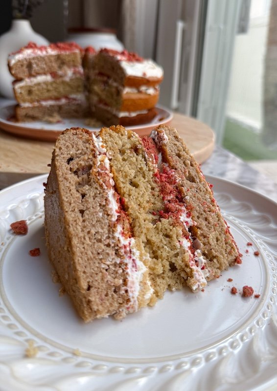 this cake is incredibly light and moist thanks to a blend of almond flour and oat flour, which gives it a soft, tender crumb without feeling too dense or heavy.