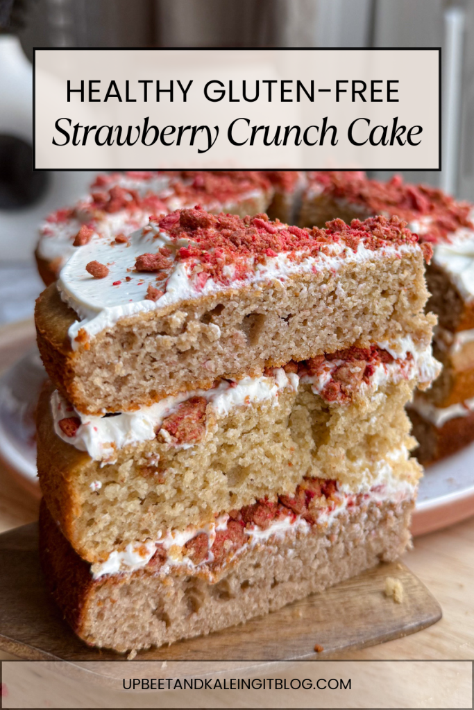 meet the healthy gluten-free strawberry crunch cake — light, fluffy, sweetened naturally, and layered with the most dreamy frosting and crunchy strawberry-cookie topping.