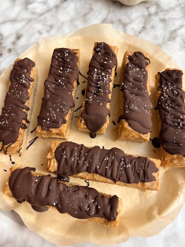 after freezing to set, you cut them into bars, melt some chocolate, and spread it over the top. a final chill in the freezer and they’re ready to enjoy.