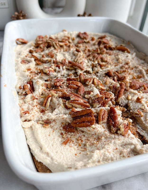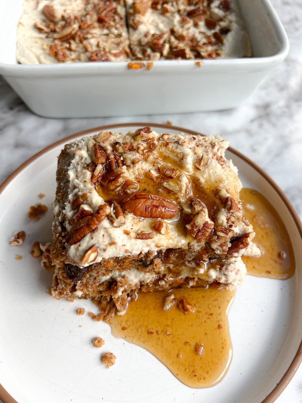 Healthy Pecan Carrot Cake Baked Oats with Cashew Frosting