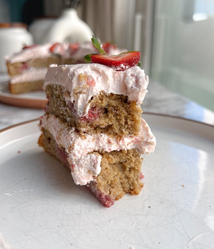 this strawberry banana cake is everything i could want for my birthday—lightened up, naturally sweet, and absolutely delicious.