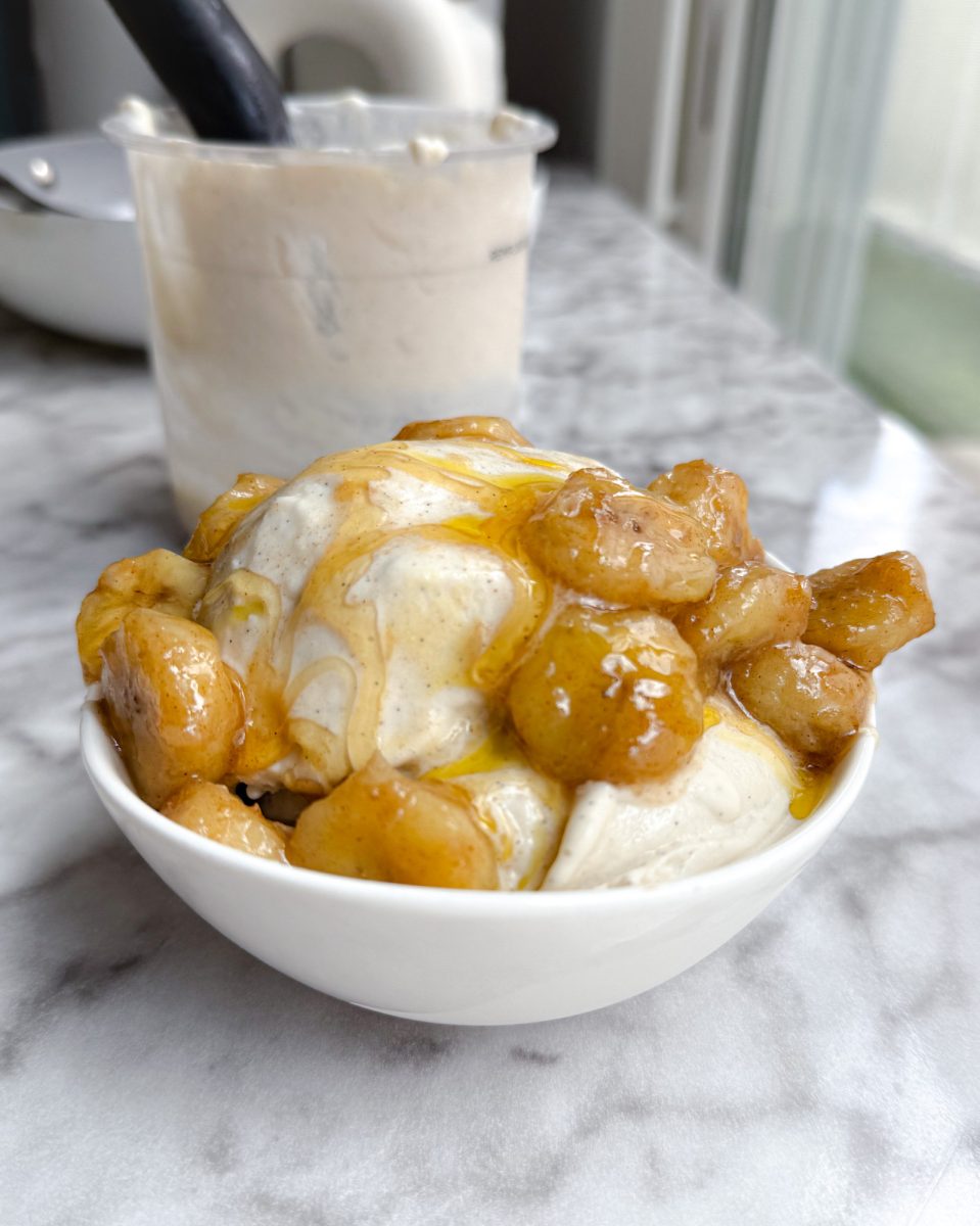 made in the ninja creami, it’s ultra smooth with a rich vanilla bean flavor and topped with sticky-sweet caramelized bananas cooked in olive oil and maple syrup.