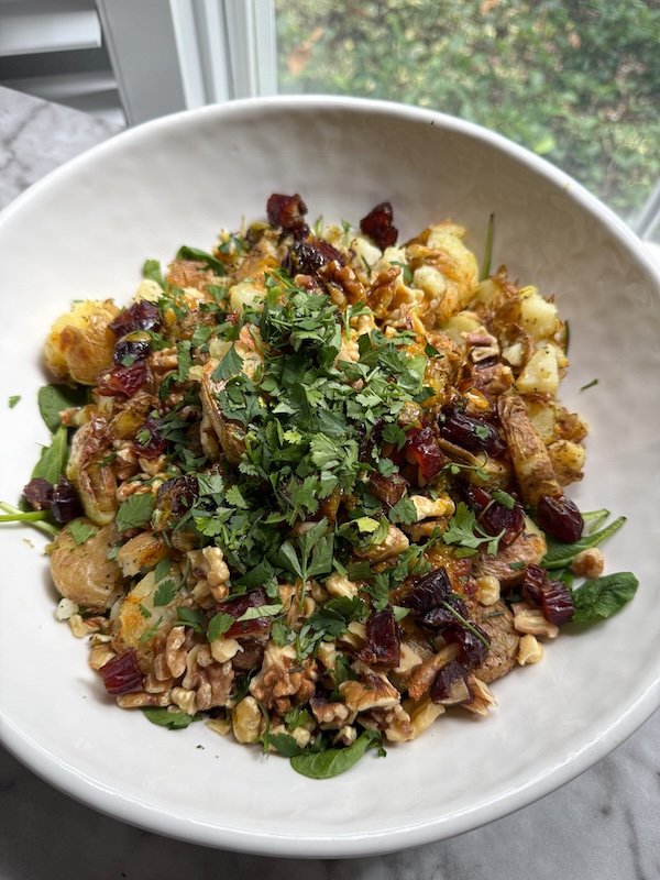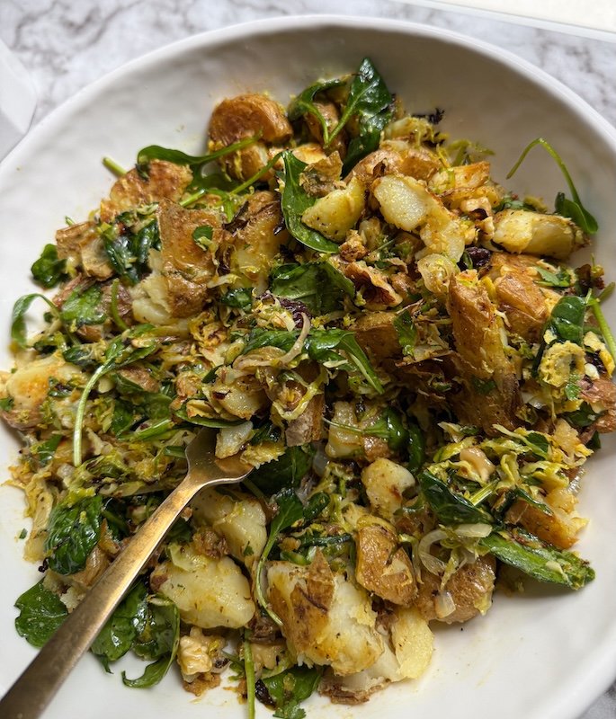 crispy smashed potatoes, caramelized brussels sprouts and shallots, tender greens, crunchy walnuts, and sweet chewy dates all tossed in a bold curry vinaigrette with a squeeze of lemon… it’s warm, savory, slightly sweet, and wildly satisfying.