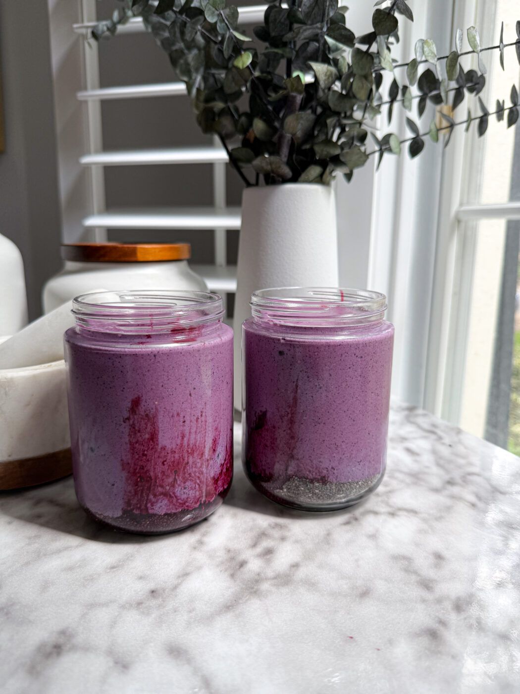 - Pour the mixture into a bowl or container and stir in the chia seeds. Also stir in optional blueberry jam.