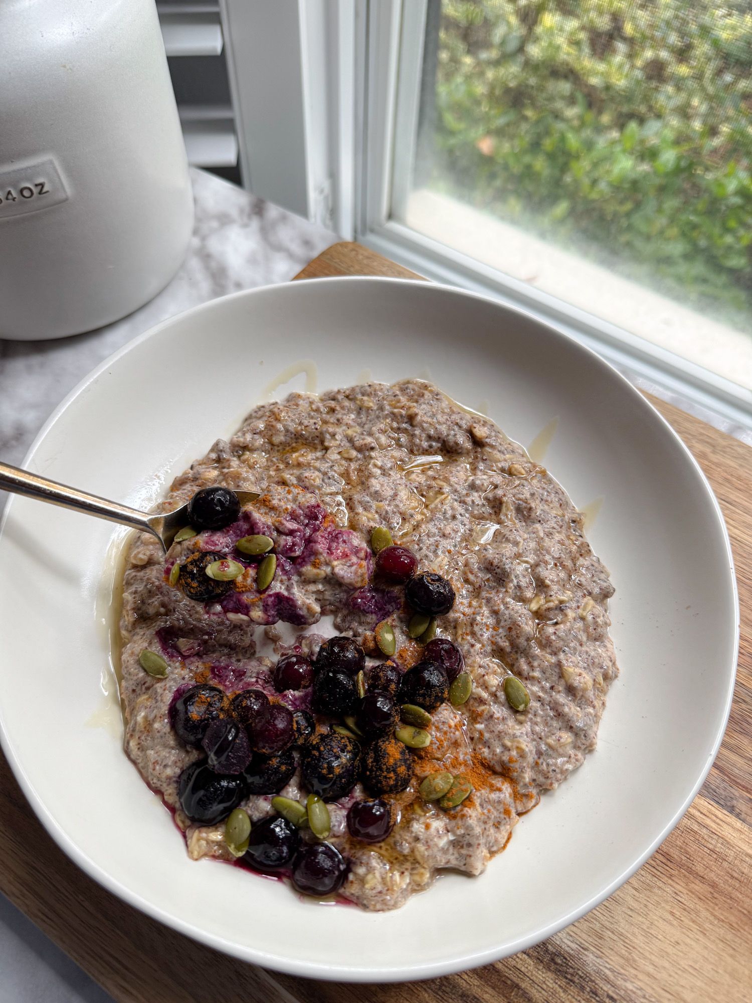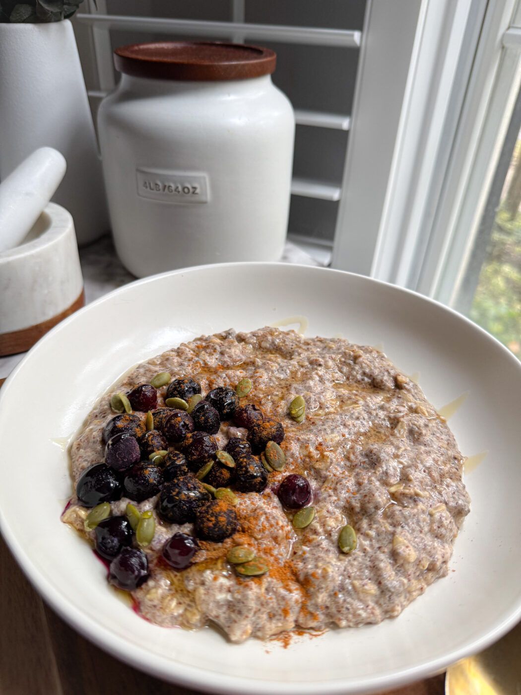 The result? Thick, creamy, almost pudding-like oats that digest slowly and keep you satisfied for hours. It’s basically a hybrid between oatmeal and hot chia pudding.