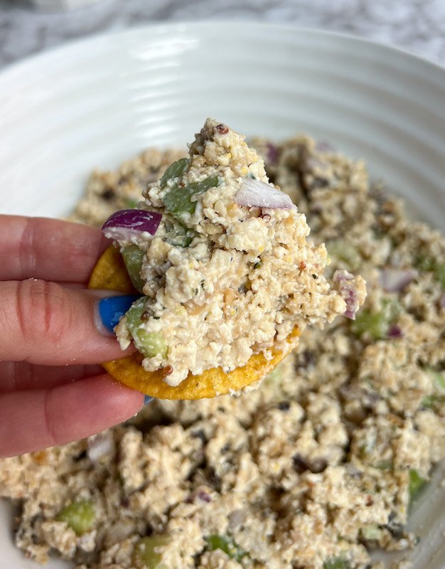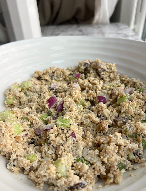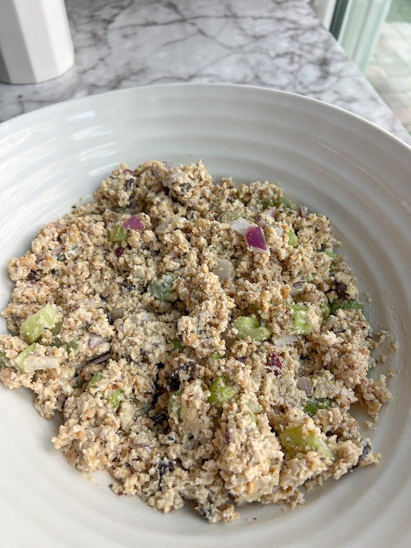 after that, it’s just a matter of mixing everything together in a bowl – the tofu and chickpea mixture, spinach, chopped celery, red onion, raisins, hemp hearts, and the creamy dressing made with vegan mayo, coconut yogurt, and seasonings.