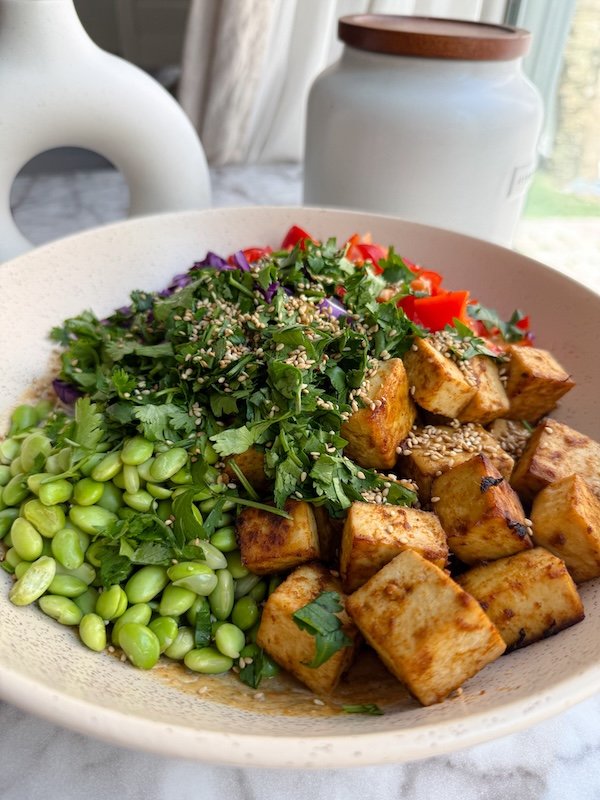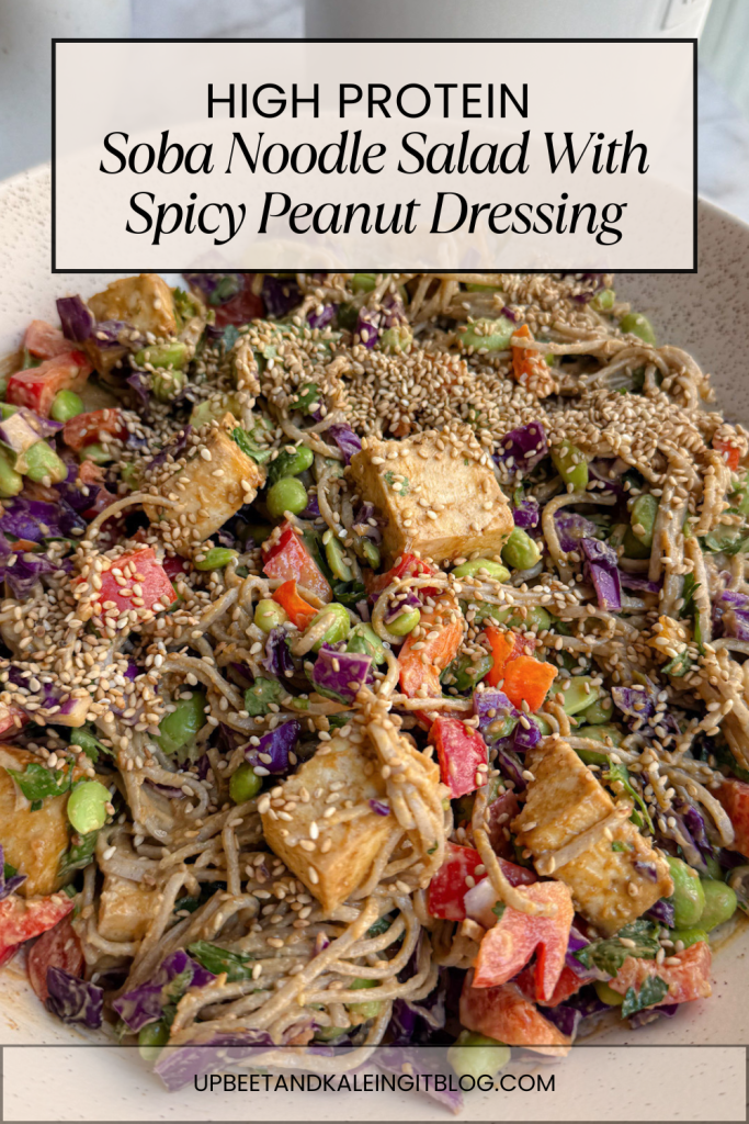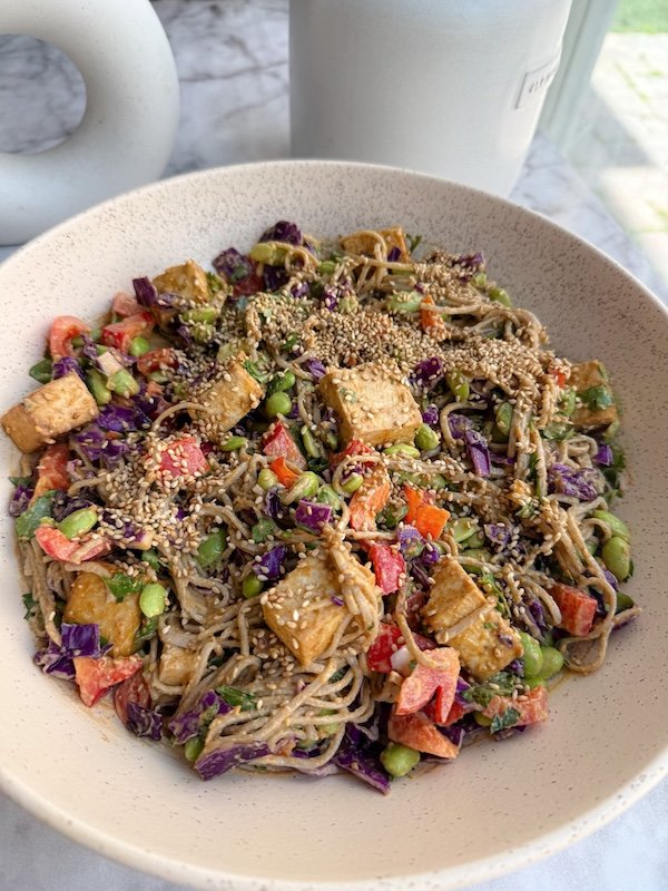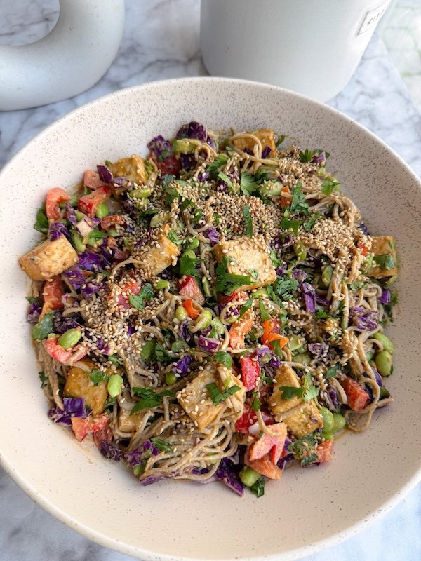 each serving has about 23 grams of plant-based protein, thanks to a combination of tofu, edamame, peanut butter, and soba noodles. it’s also rich in healthy fats from avocado or olive oil and peanut butter, plus fiber and vitamins from the vibrant veggies.