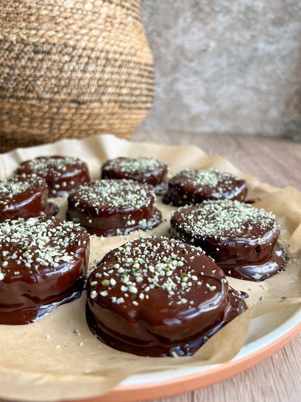 the rich chocolate coating, made with unsweetened chocolate chips and coconut oil, adds a velvety finish to these hormone-support cookies.
