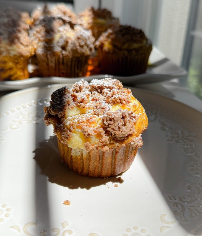 they’re everything you want in a cozy treat — fluffy, warmly spiced pumpkin muffins with a cheesecake-like dollop of cream cheese on top and a buttery cinnamon streusel that gives the perfect crunch.