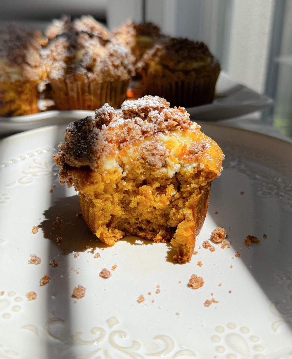 they’re everything you want in a cozy treat — fluffy, warmly spiced pumpkin muffins with a cheesecake-like dollop of cream cheese on top and a buttery cinnamon streusel that gives the perfect crunch.