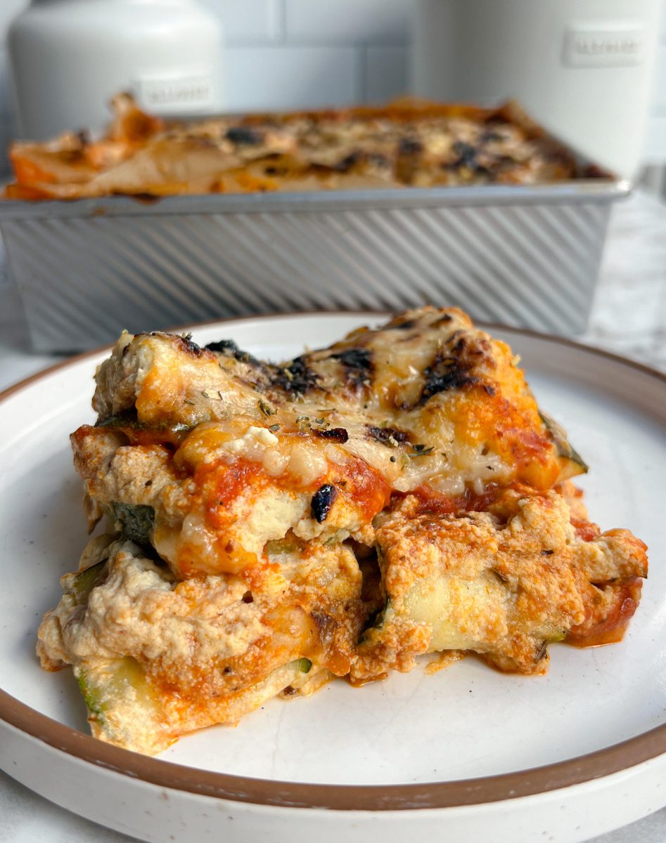 this low-carb plant-based protein-packed zucchini lasagna has everything you love about the classic dish—layers of flavor, a creamy filling, and a hearty marinara—without the carb content.