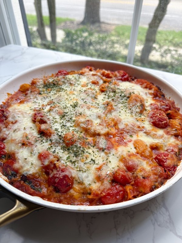 it’s the perfect cozy side dish or light main packed with roasted tomatoes, gooey mozzarella, and lots of fresh basil.