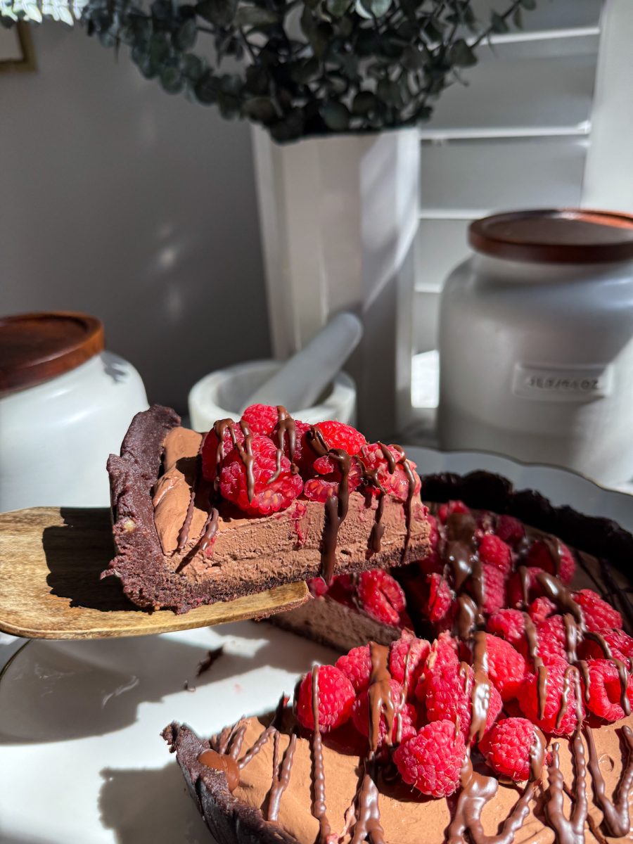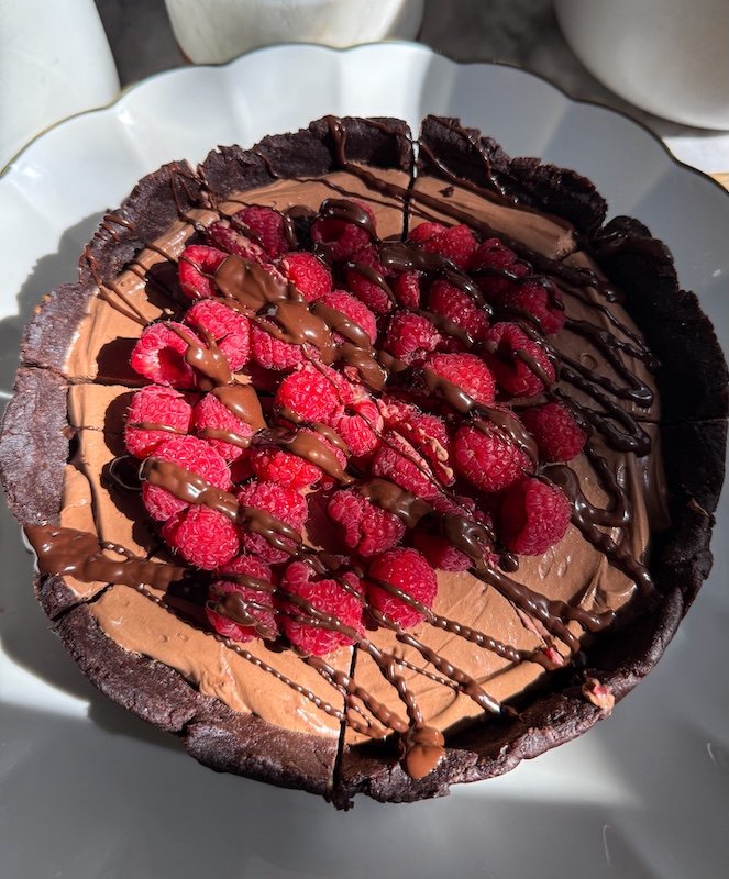 the crust is dense, chocolatey, and naturally sweetened with dates, while the filling is thick, creamy, and almost truffle-like once chilled.
