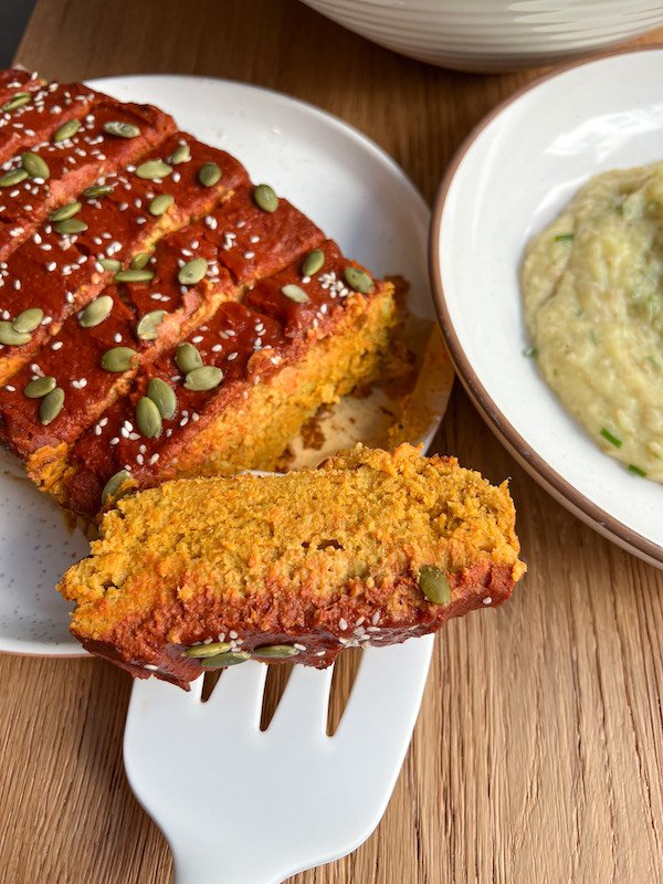 the chickpea loaf, packed with carrots, celery, and a blend of savory spices, bakes to perfection with a tasty ketchup, tomato, and tahini topping.