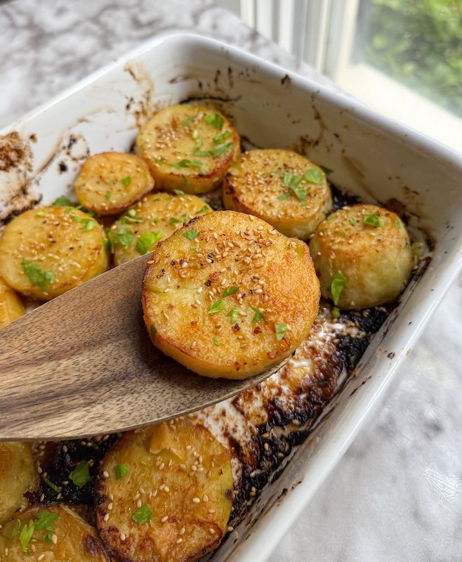 - return to the oven and bake for another 12 minutes, or until tender inside and caramelized on the edges. serve warm and garnish with sesame seeds + green onion if desired.