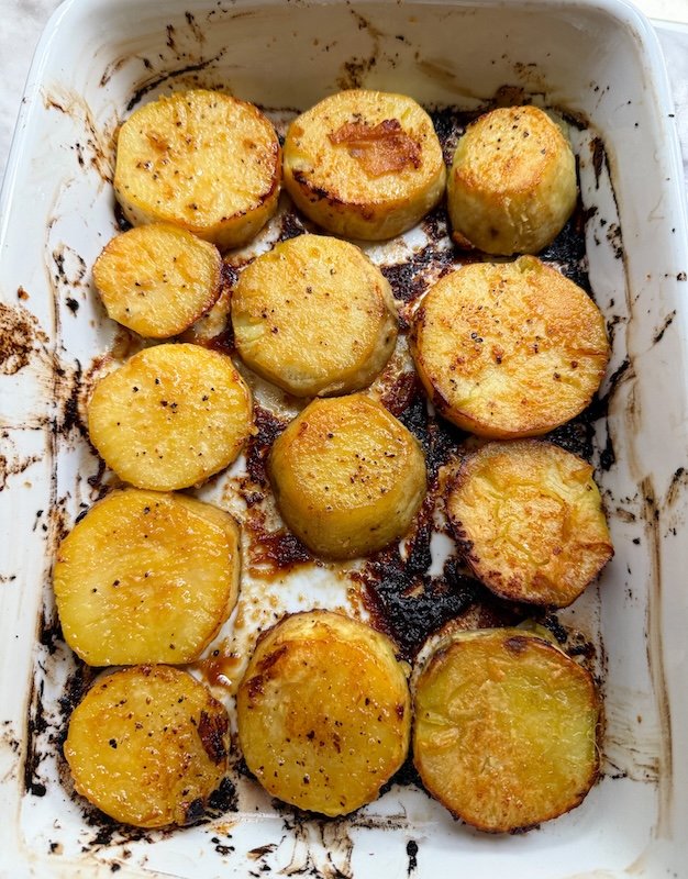 - preheat oven to 400°f. peel the sweet potatoes and slice into 1-inch rounds. place them in a 9 x 13-inch baking dish in an even layer.