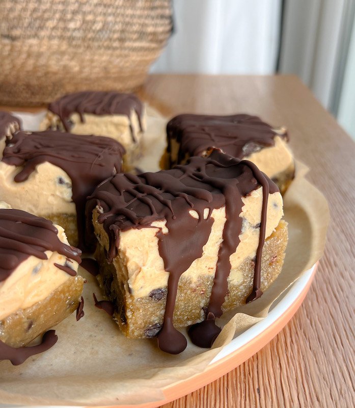 the base is made from doughy chocolate chip cookie dough, which has that classic, nostalgic taste we all know and love but it’s made with AMAZING ingredients!