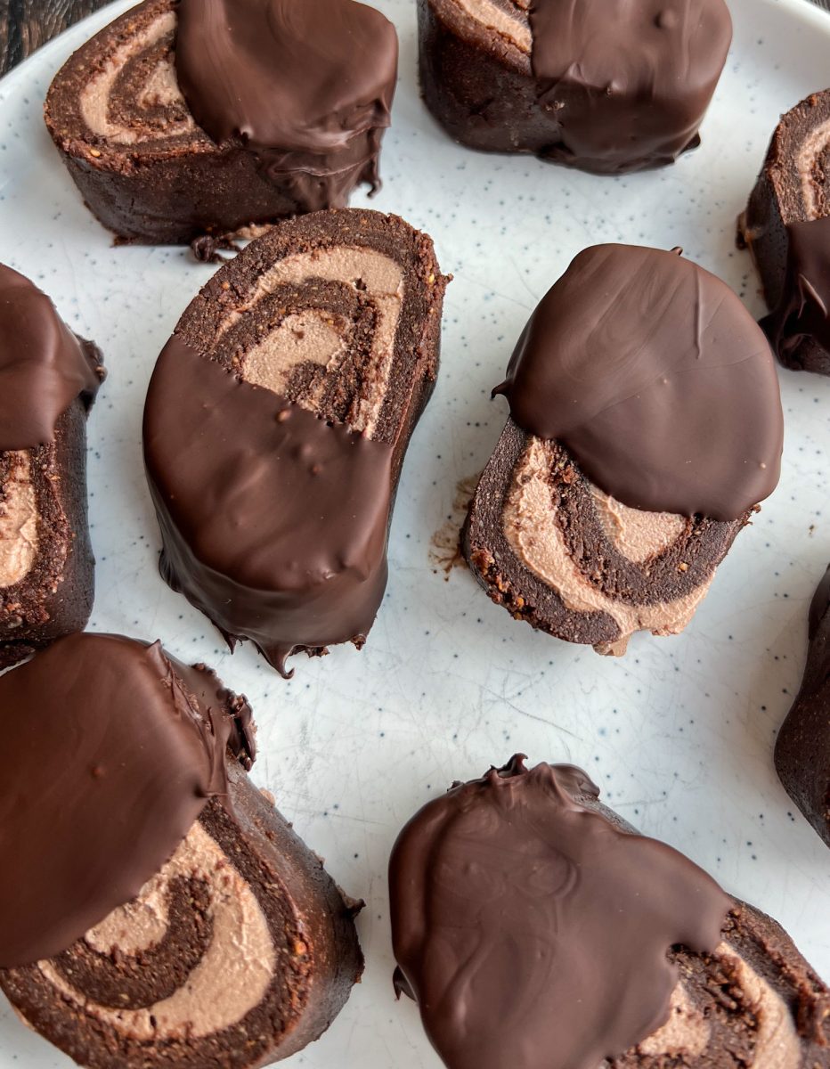 i’ve created several versions of no bake rolls over time, from caramel, cinnamon and fruity fillings, but this version is dedicated to all the chocolate lovers out there.