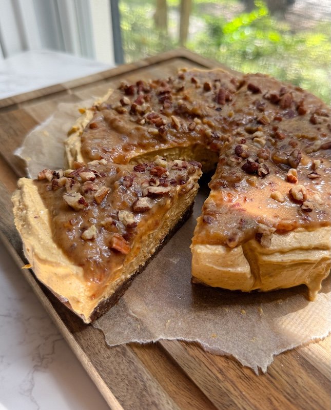 pumpkin puree is loaded with vitamin a and antioxidants. the protein powder brings each slice to about 11 grams of protein, making this a more balanced treat than your typical cheesecake.