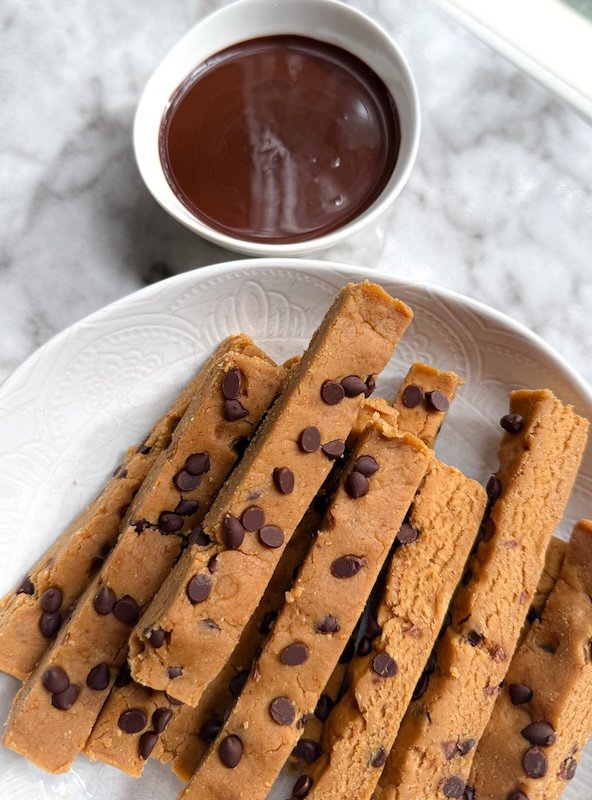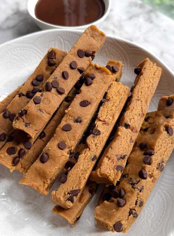 thanks to the peanut butter and vanilla protein powder, these cookie dough fries offer a nice boost of protein compared to your average snack or dessert.