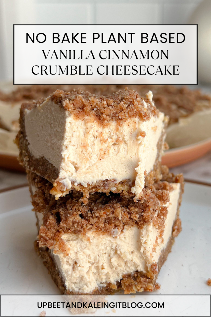 if you’re a fan of rich, creamy, and satisfying desserts, you’re going to love this no bake plant-based vanilla cinnamon crumble cheesecake.
