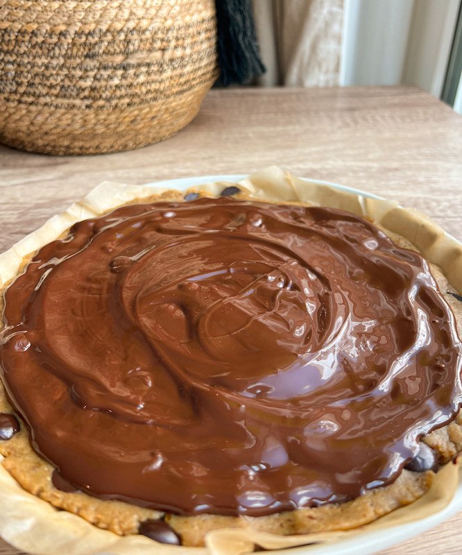 -after the cookie dough has set in the freezer, melt additional chocolate if desired and pour it over the top of the cookie dough layer. spread it evenly using a spatula. - chill: