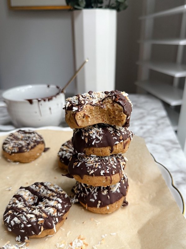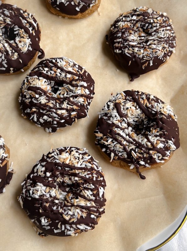 - remove the donuts from the freezer and spoon the melted chocolate over the tops. sprinkle with extra shredded coconut. return the donuts to the freezer for about 2 hours, or until fully set. once firm, pop them out of the molds and enjoy.