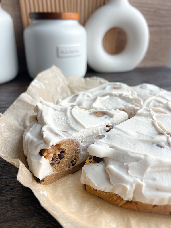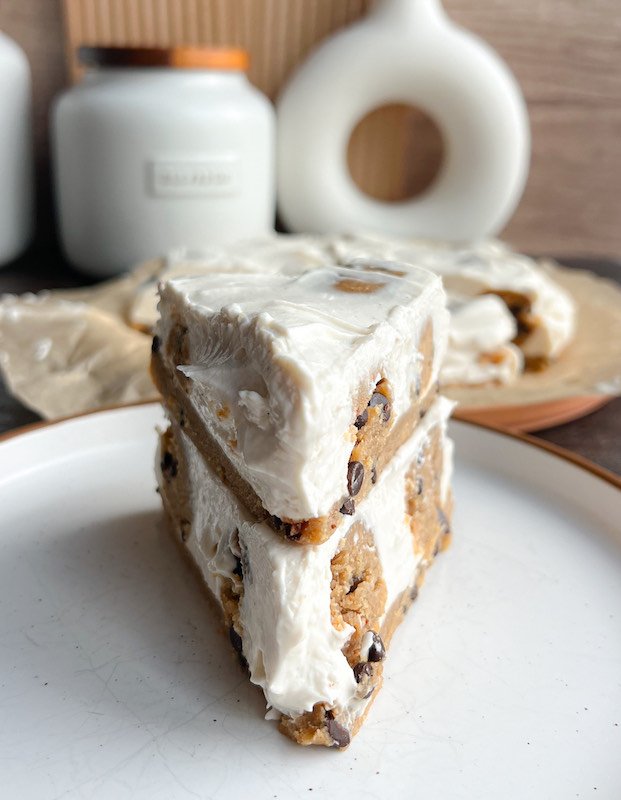 if frozen, let each slice sit at room temperature for 10-15 minutes before enjoying. this way, the filling softens and becomes creamy, and the cookie dough is just right.