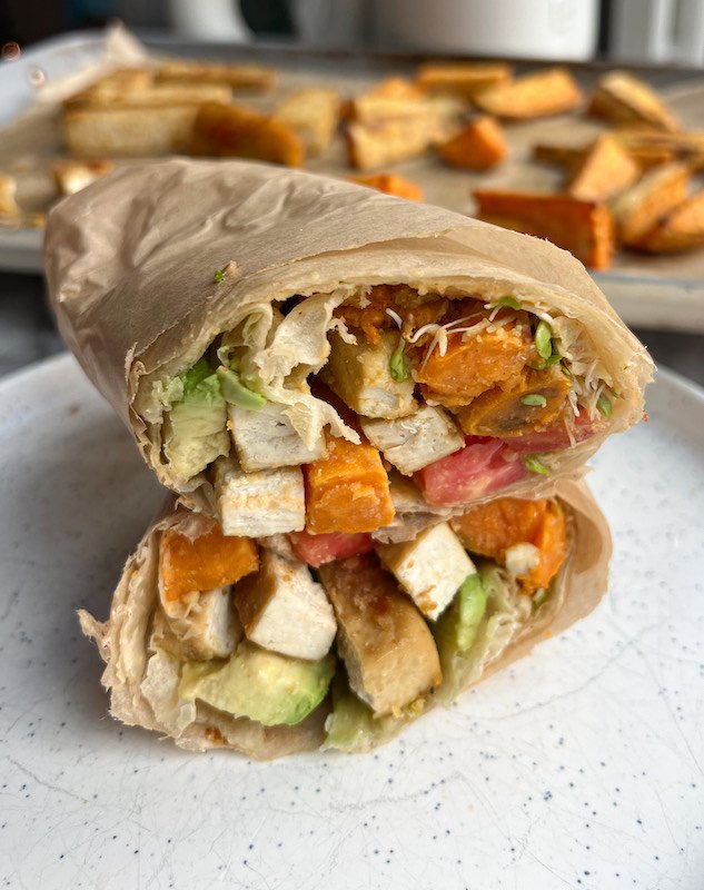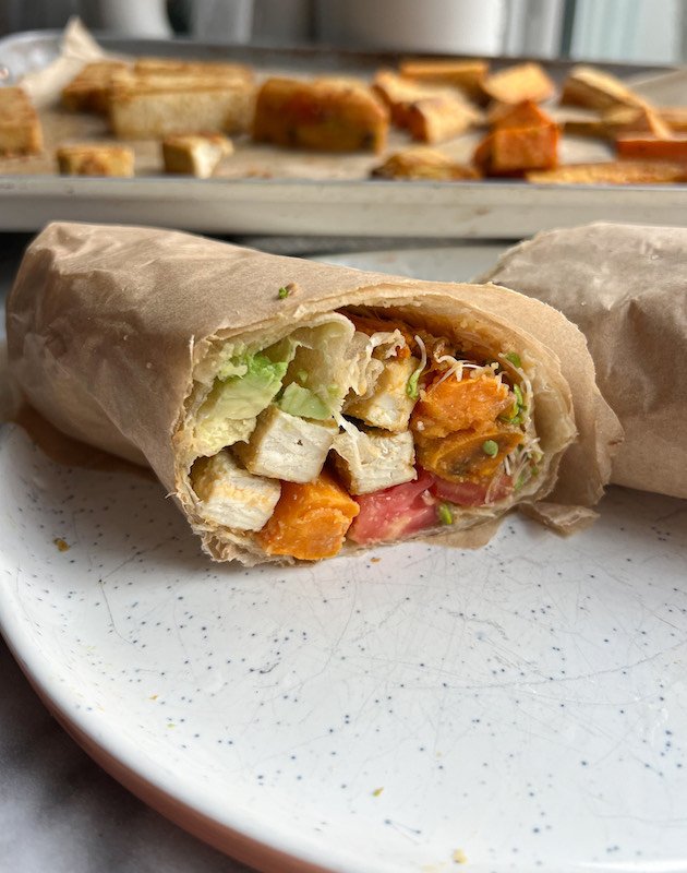 - assemble: spread a generous layer of hummus onto your tortilla, then layer on the roasted sweet potatoes, tofu, sprouts, tomato slices, and avocado. fold the sides and roll tightly to create a wrap.