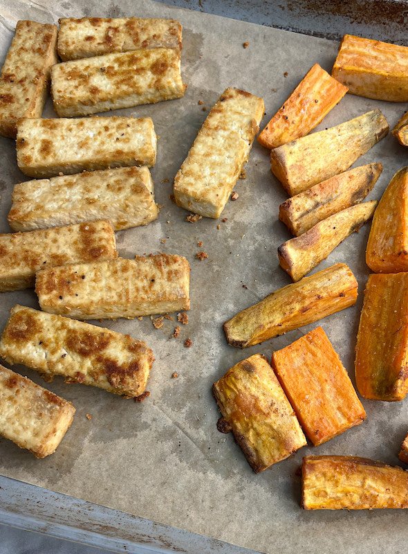 preheat the oven to 400°f (200°c). toss the diced sweet potatoes with avocado oil, smoked paprika, garlic powder, and sea salt. spread evenly on a baking sheet. - roast the tofu: