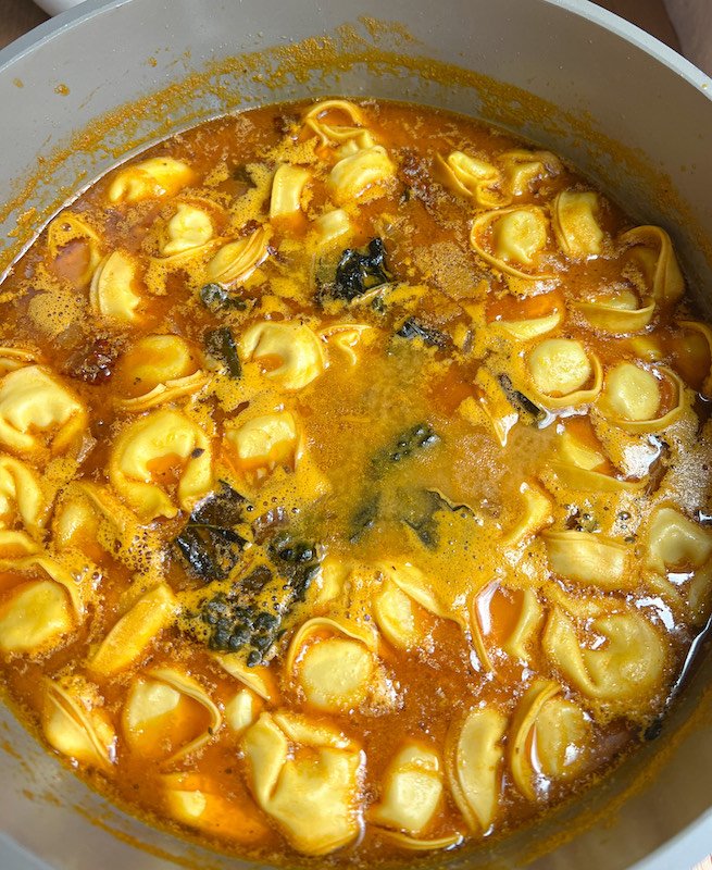 - in a separate pot, cook the vegan tortellini according to the package instructions. once cooked, drain and add to the soup.