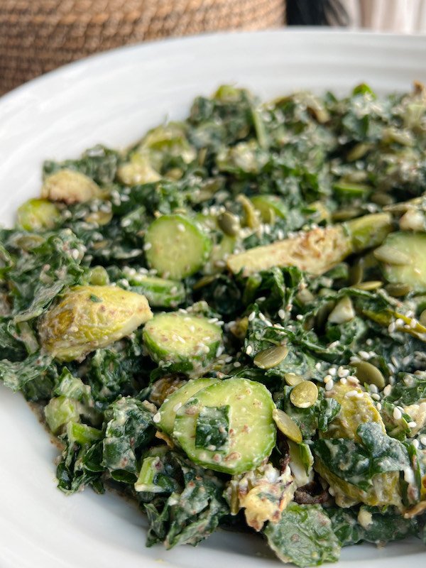 combine the kale, brussels sprouts, cucumber, green onions, pumpkin seeds, vegan feta, and flax meal in a large salad bowl.