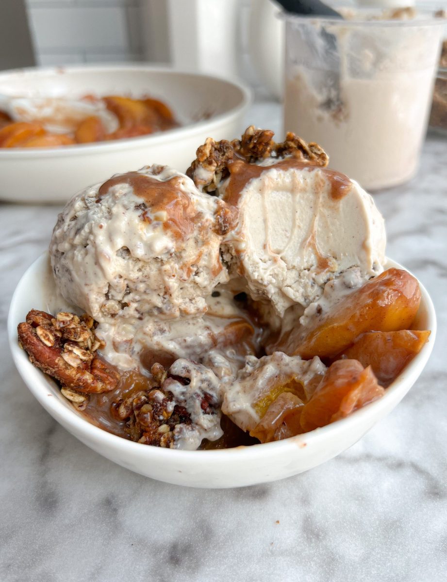 nourishing vegan protein granola ice cream & cinnamon coconut sugar peaches