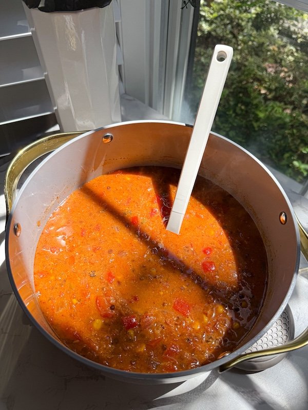 this soup is the ultimate comfort food. you get the hearty, earthy bite of tender brown lentils, the sweetness of fire-roasted corn and bell peppers, and the gentle heat from jalapeño and chili spices.